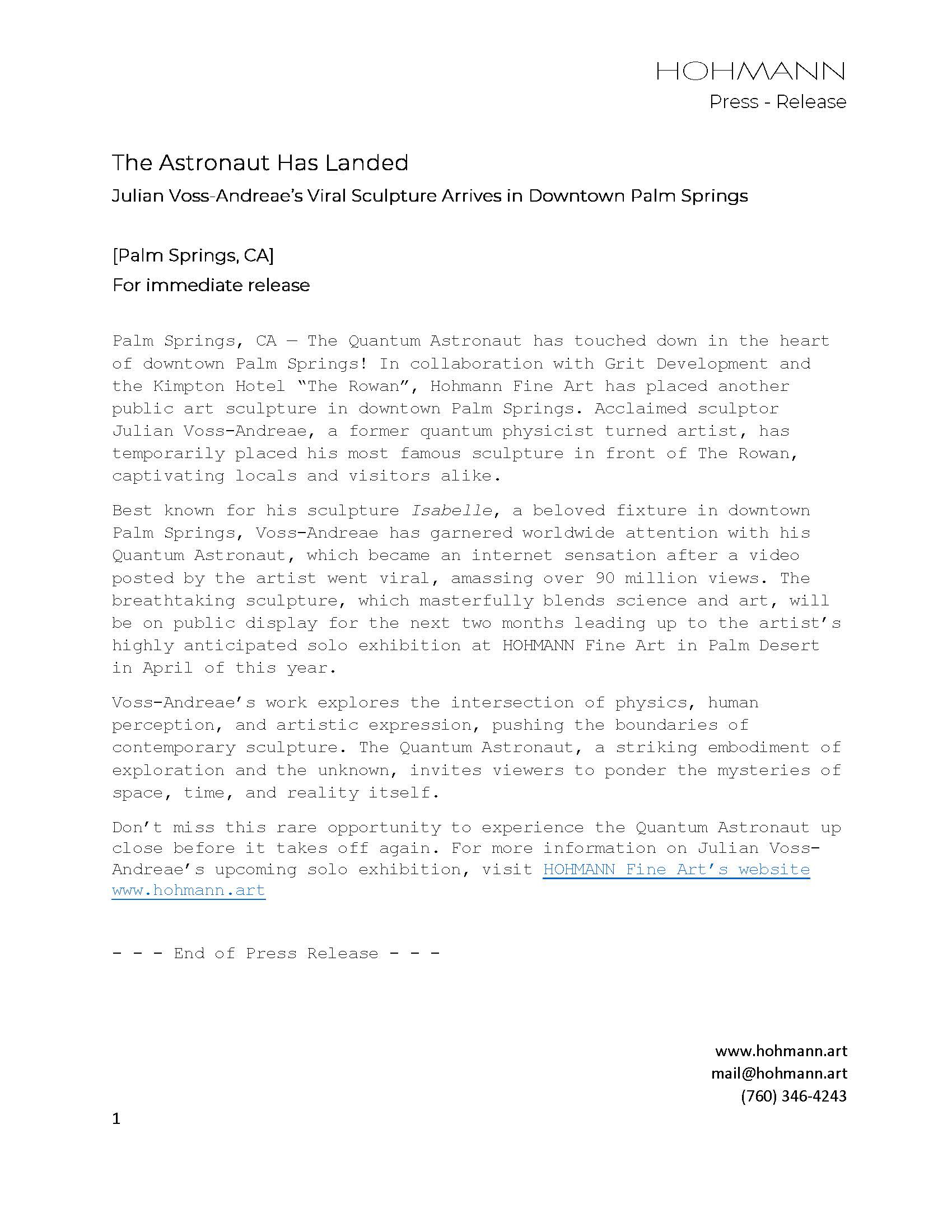 - "The Astronaut Has Landed: Julian Voss-Andreae’s Viral Sculpture Arrives in Downtown Palm Springs" - HOHMANN, 2025